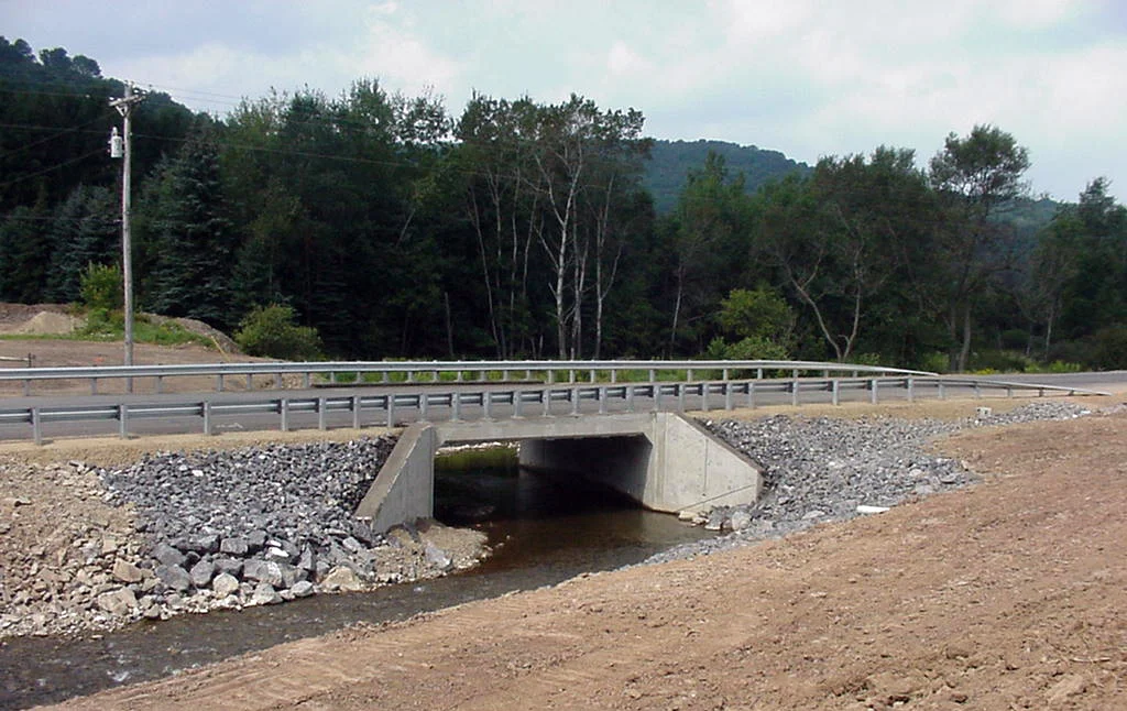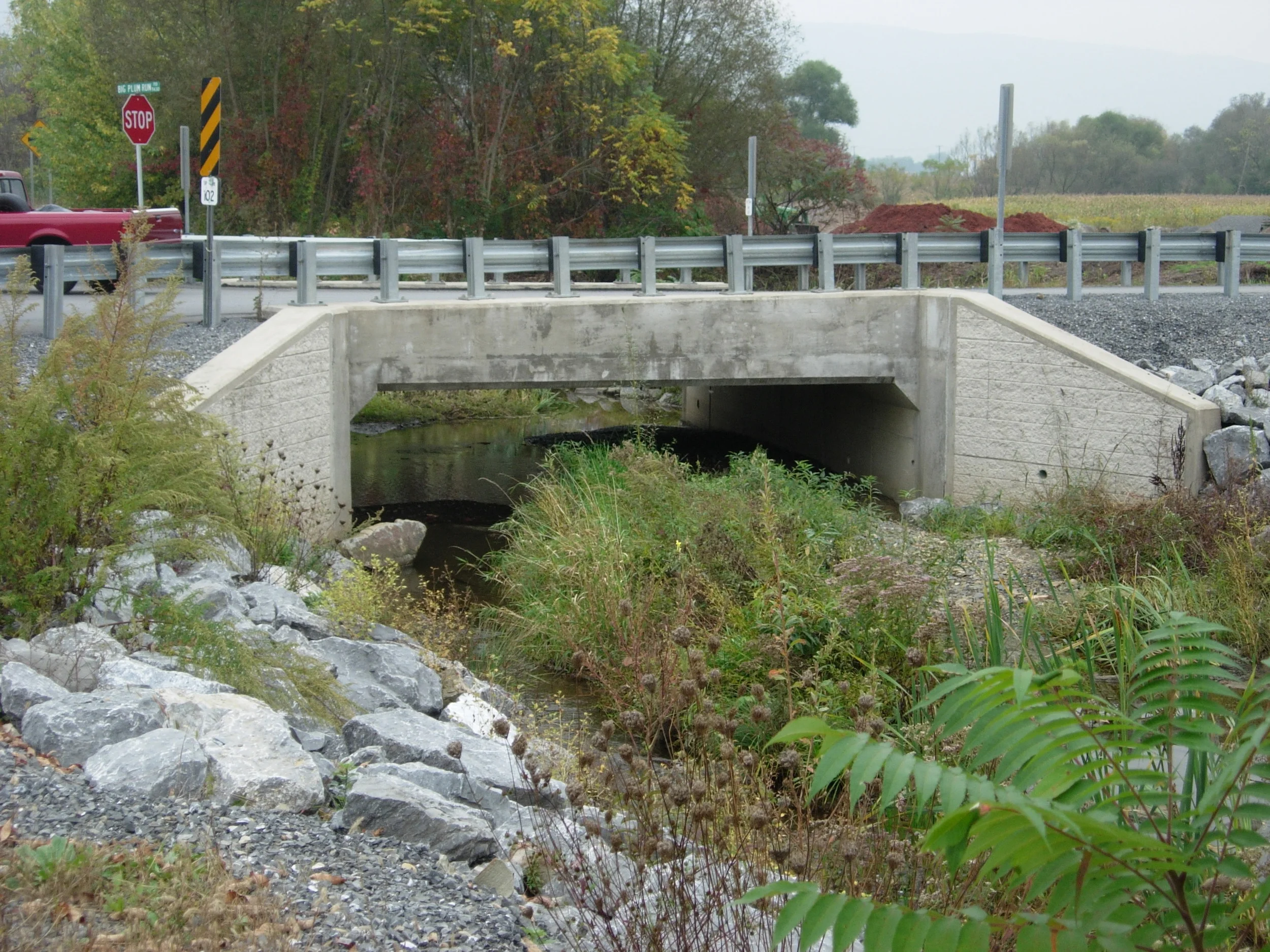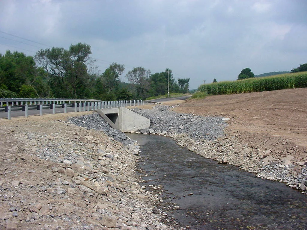S.R. 0019, Section A20 (ECMS #76027) - - Greene County - The project consisted of the replacement of the existing slab bridge carrying SR 0019 over Shannon Run with a precast reinforced concrete box culvert. Approach roadway construction was minimal. Wades Run, which parallels S.R. 0019 to the west, was relocated away from roadway in order to accommodate the roadway typical and fill slopes and to minimize future slope maintenance. To mitigate for the stream impacts, items including in-stream log structures and tree plantings were included with the project. Traffic was maintained via detour during construction.