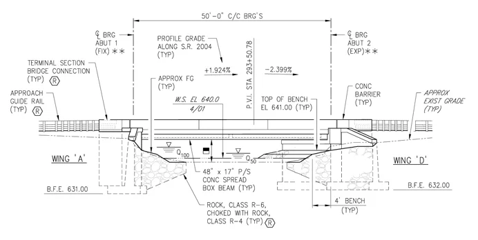 This project included a single span (87’ c/c brgs.) precast concrete adjacent box beam bridge with conventional cantilever abutments. The project also included 675’ of approach roadway reconstruction.