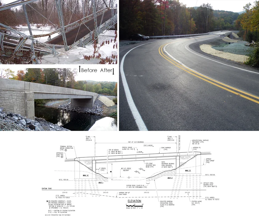 Clearfield Creek Bridge #2 – Emergency Bridge Replacement over Clearfield Creek - This project included a single span (100’-0” overall c/c brgs.) precast concrete adjacent box beam bridge. The bridge was replaced on an emergency basis due to failure of the existing steel truss from traffic damage. The project also included approximately 675’ of approach roadway work.