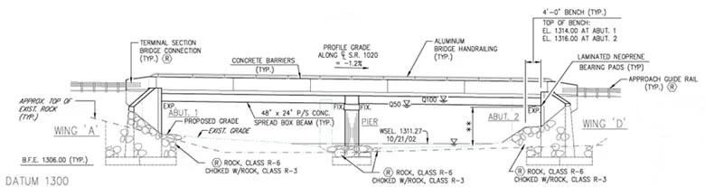 Bridge Replacement - Potter County - This project includes a two span (98'-6" c/c brgs.) precast concrete spread box beam bridge over the West Branch of Pine Creek. The project also includes 535' of approach roadway reconstruction.