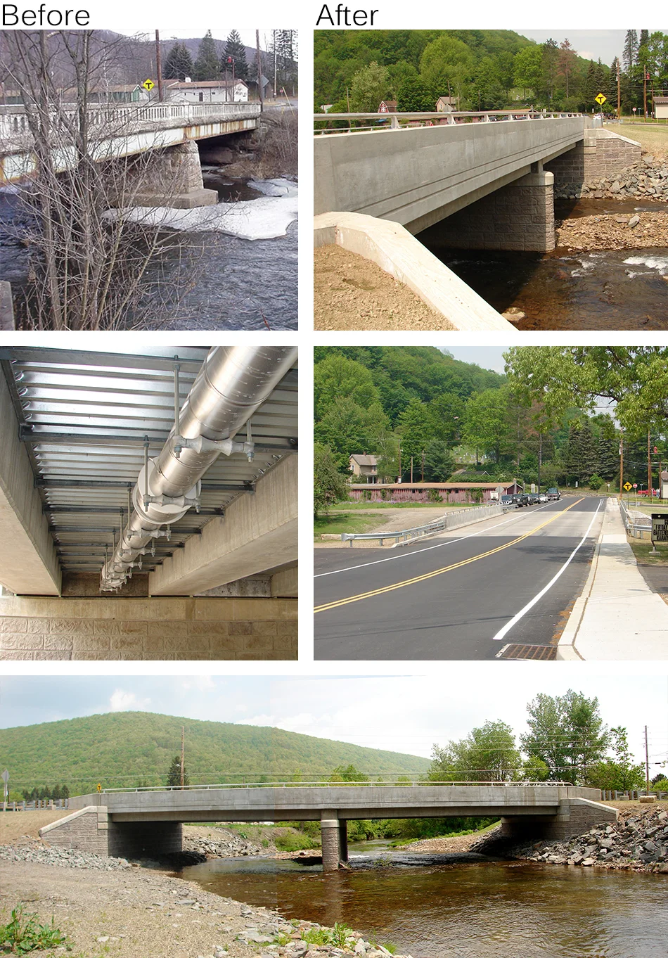 US 6/Allegheny River Bridge Replacement  - This project included a single span (63’ c/c brgs.) prestressed concrete spread box beam bridge with integral abutments. The abutments and bridge barrier included a brick architectural surface treatment to complement an adjacent historic building. The project included 280’ of approach roadway reconstruction. The project also included minor intersection and roadway improvements on a local street network in Coudersport to accommodate detoured traffic during construction of the bridge. The detour was comprised partially of a pair of one-way roads in a residential community and included two temporary traffic signals.