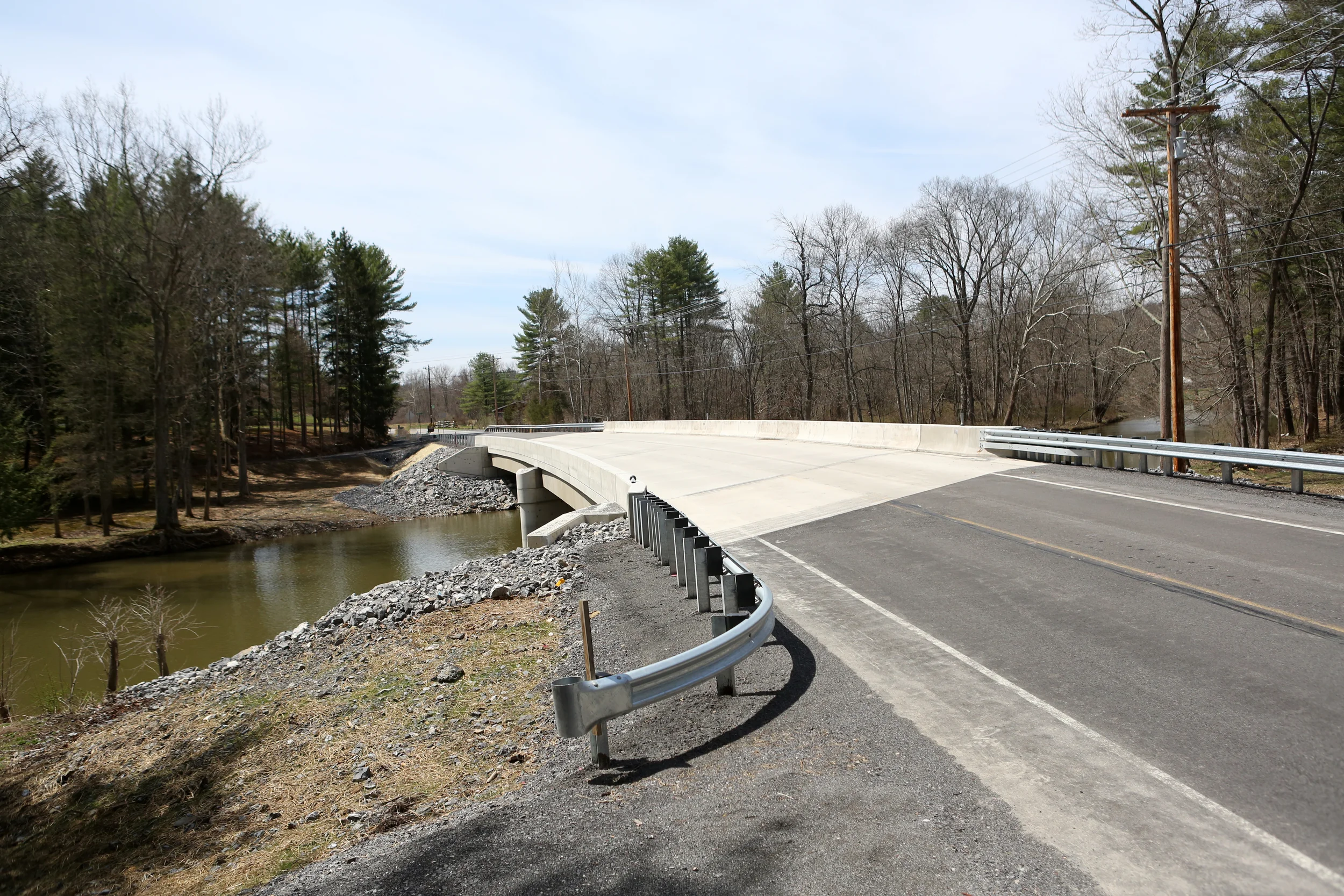 Bridge Replacement over the Beaverdam Branch of the Juniata River. This project includes a two (2) span (136’-0 ¾” overall c/c brgs.) precast concrete adjacent box beam bridge on a slight curve. The bridge included a pedestrian facility and architectural surface treatments to mimic a nearby park facility. The project also included approximately 490’ of approach roadway work.